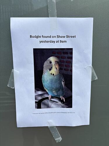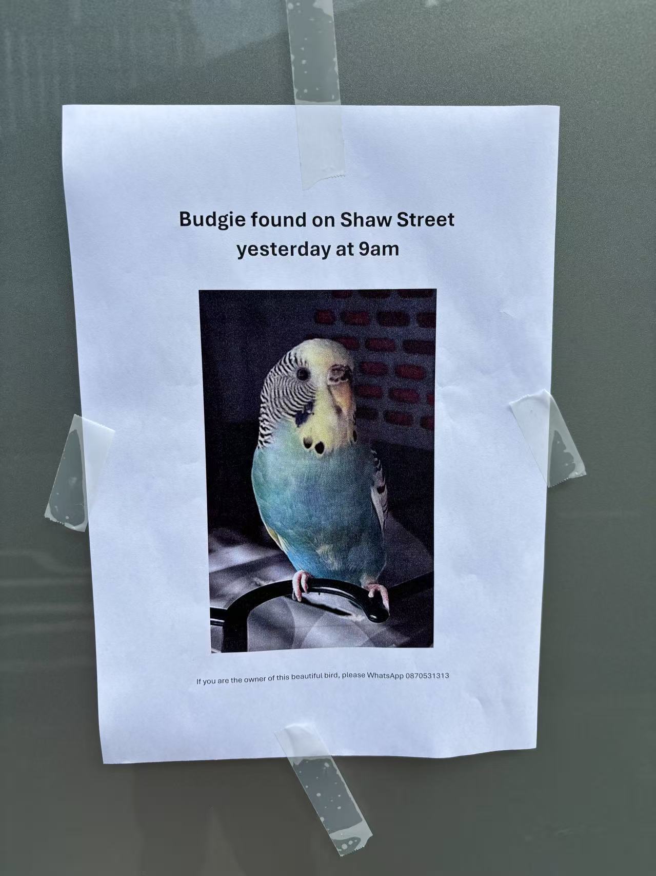 I saw this poster on the window of a store on the street. It said: Budgie found on Shaw Street yesterday at 9am, If you are the owner of this beautiful bird, please WhatsApp 0870531313