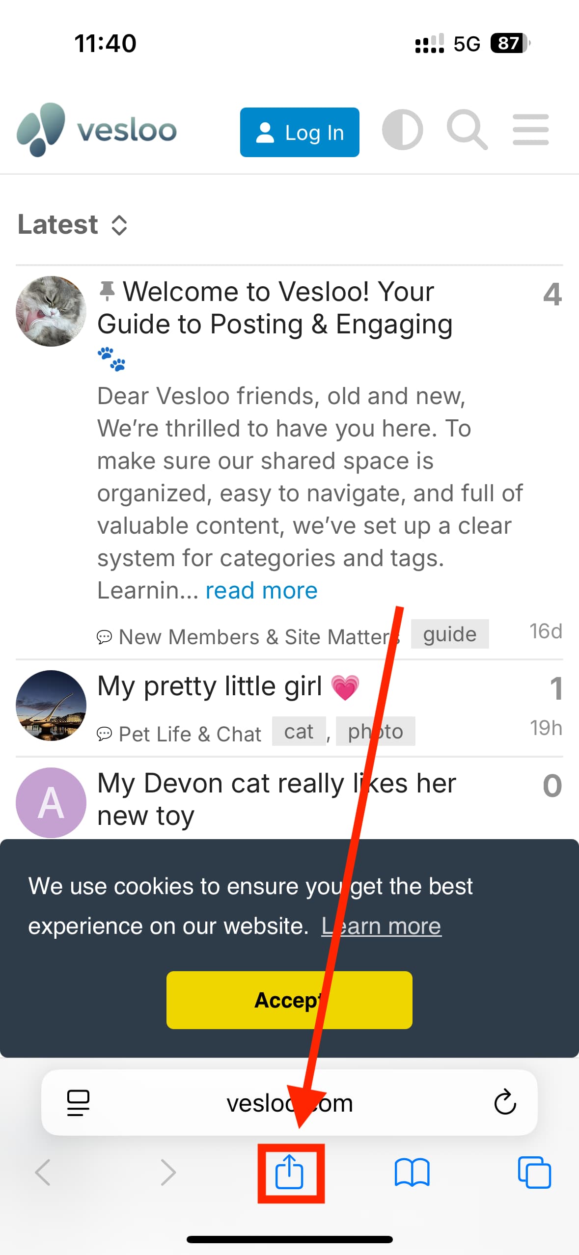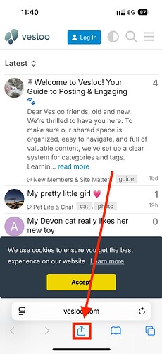 https://www.vesloo.com. - Look for the “Share” button at the bottom of the screen. It’s a square with an arrow pointing up. Tap it.