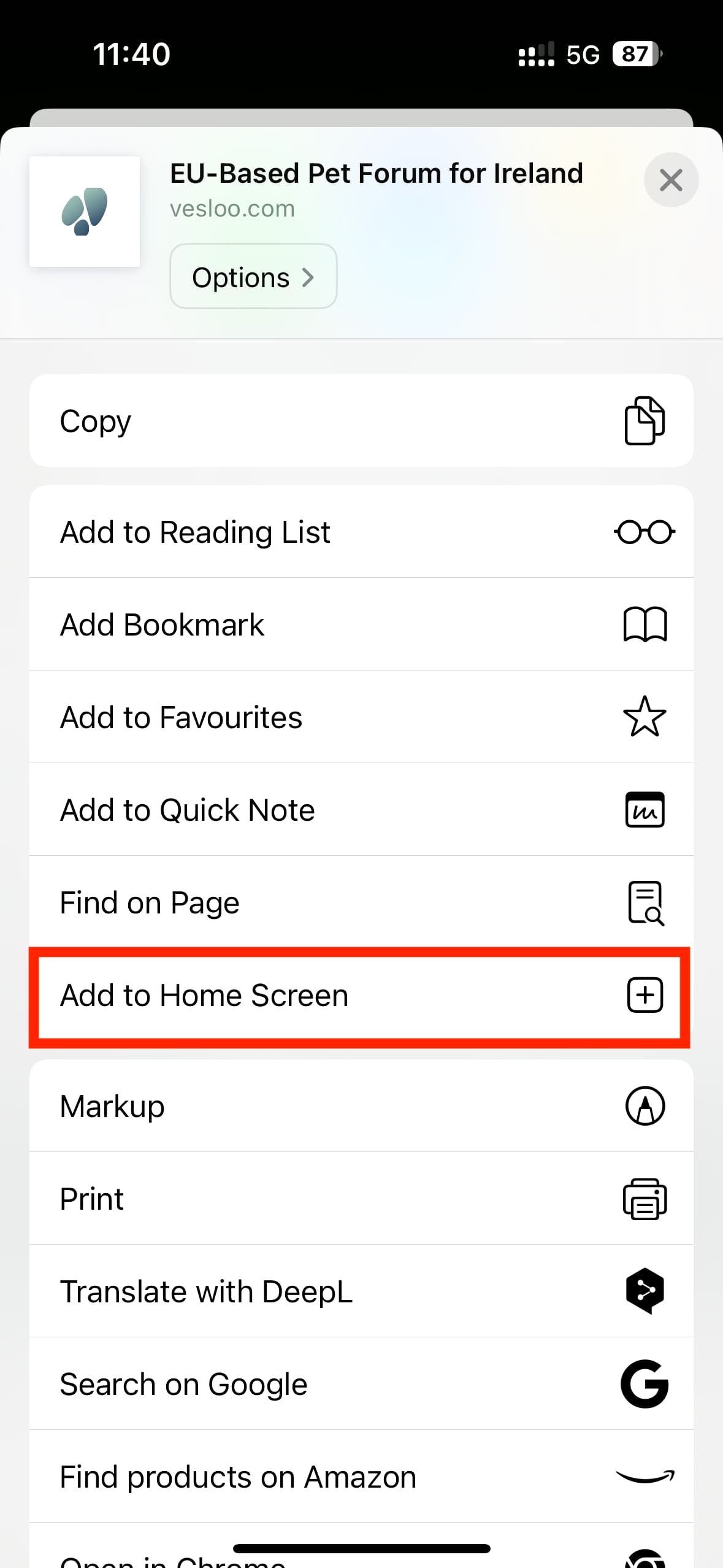 - In the menu that appears, scroll down until you see the option “Add to Home Screen”. Tap it.
