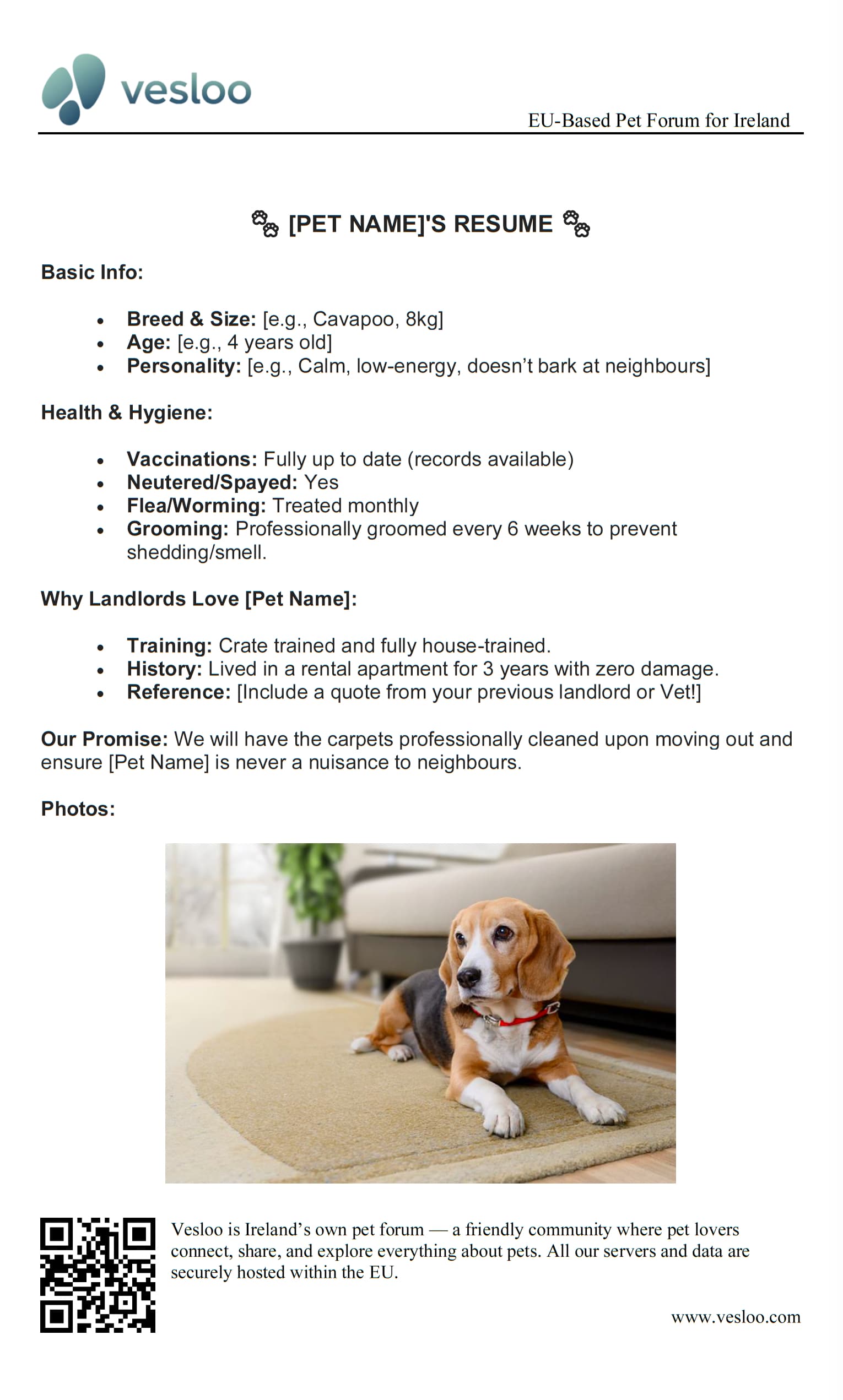 VESLOO has created a pet resume template for you, and it looks like this: