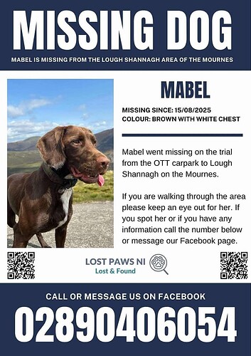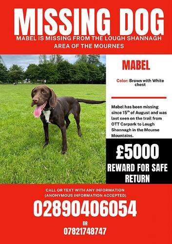 It has now been one week since Mabel went missing. Despite extensive daily and nightly searches with drones (thermal), search dogs, and many volunteers, there have been no confirmed sightings.